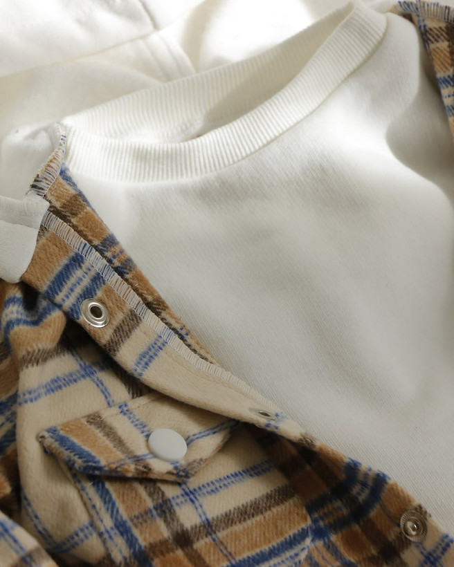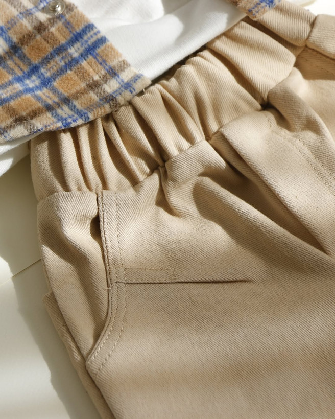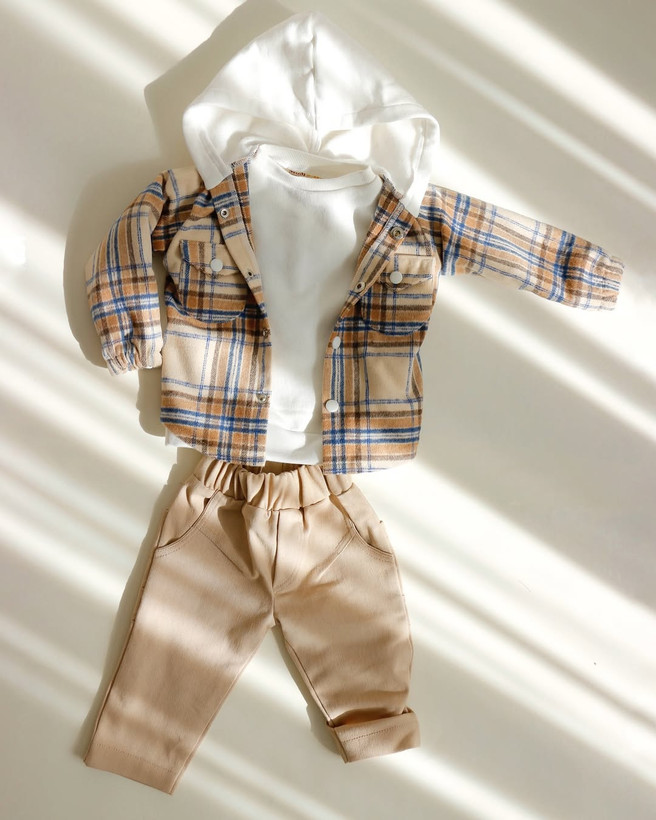 دیدن محصولات مرتبطست اسپرت سه تکه شامل هودی کشمیر ترک ترکیب با دورس تیشرت سفید و شلوار بگ کتان قابل سفارش از ۱سال تا ۷سال